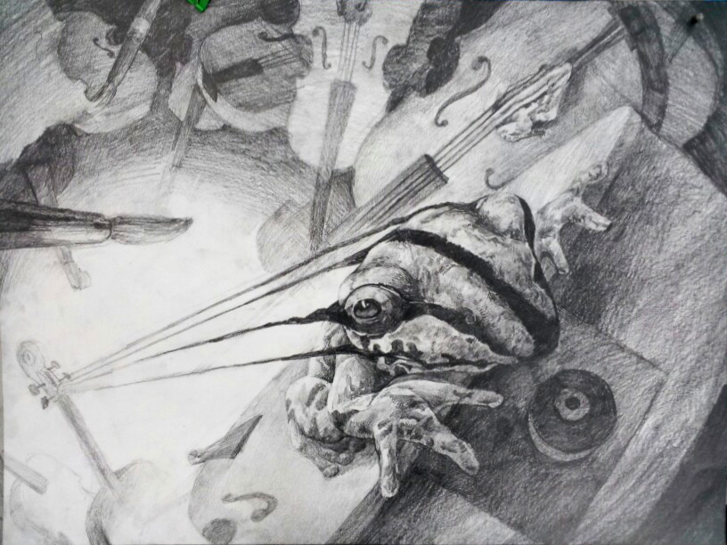 입시 미술을 하다보면 도움되는 몇몇 능력이 있습니다. 만일 머릿속에서 대상을 3D로 잘 상상할 수 있는 사람이라면 그림 그리는 것이 훨씬 수월해집니다. 위에 그려진 개구리는 원래 저 모양으로 사진을 주지 않았습니다. 그냥 등이 보이는 평범한 개구리였죠. 하지만 몇 번의 시행착오를 거쳐서 전혀 다른 각도의 개구리를 그릴 수 있었고, 그 점에서 높은 평가를 받았던 기억이 납니다. 그리고 그림에 이야기를 넣는 것도 굉장히 중요합니다. 개구리의 줄무늬와 바이올린의 줄의 생김새가 유사하다는 것을 응용해서 이야기를 그려보았습니다. 마치 바이올린을 탈출하려는 개구리처럼 말입니다.